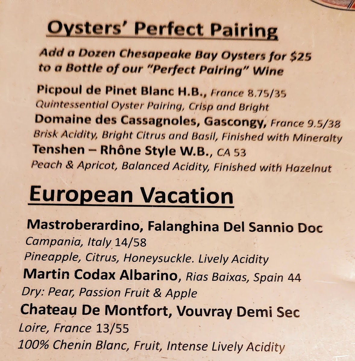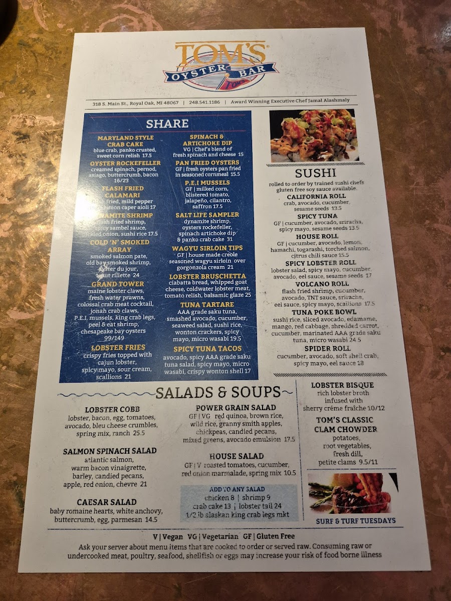 Tom's Oyster Bar Menu